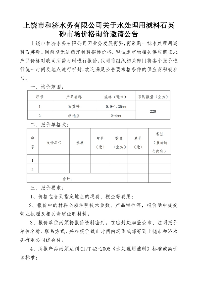 上饒市和濟(jì)水務(wù)有限公司關(guān)于水處理用濾料石英砂市場(chǎng)價(jià)格詢價(jià)邀請(qǐng)公告